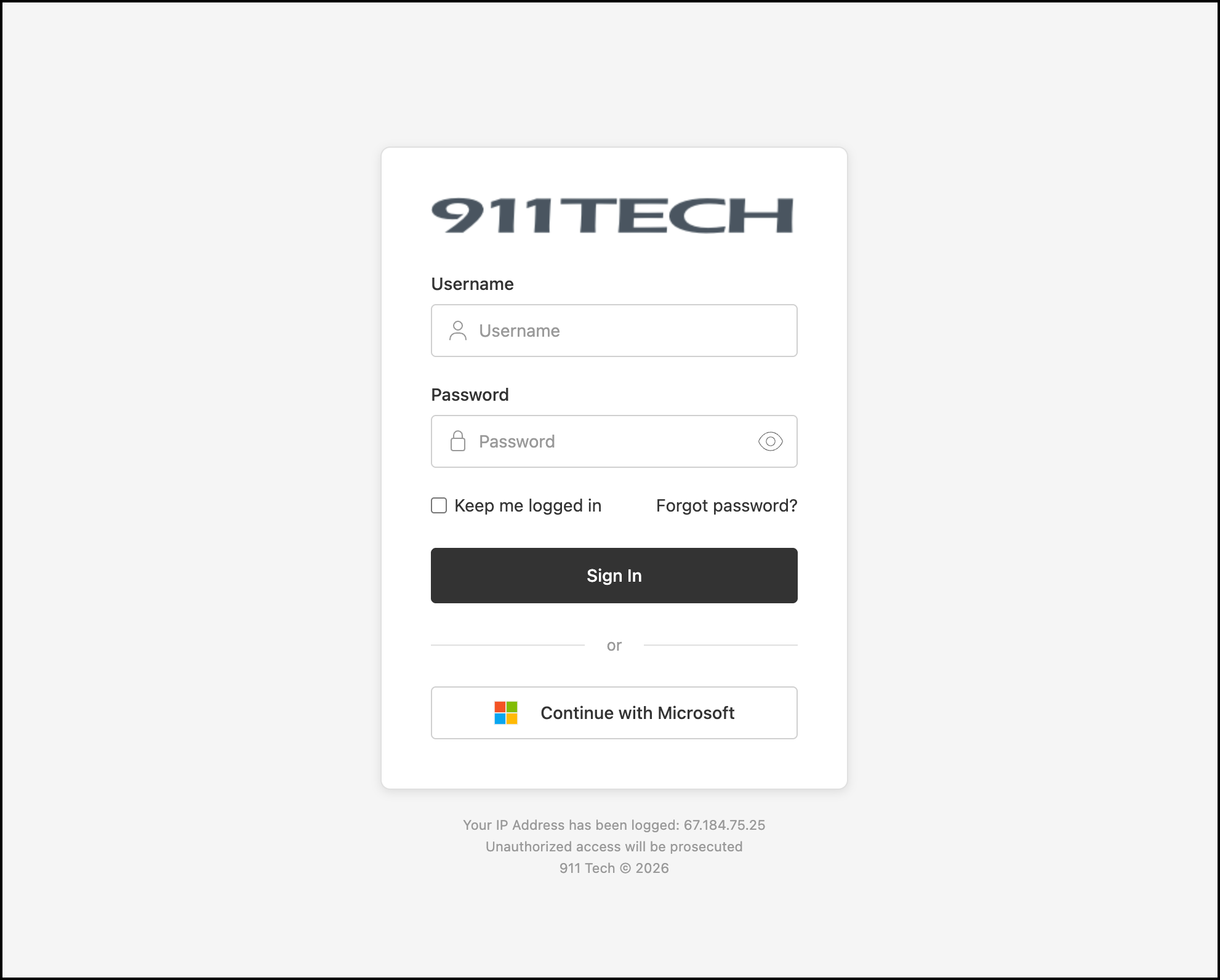 If your agency has setup Microsoft Authentication for 911 Tech, you can click the Continue with Microsoft button to bypass our standard login and login to 911 Tech using your agency supplied Microsoft credentials.