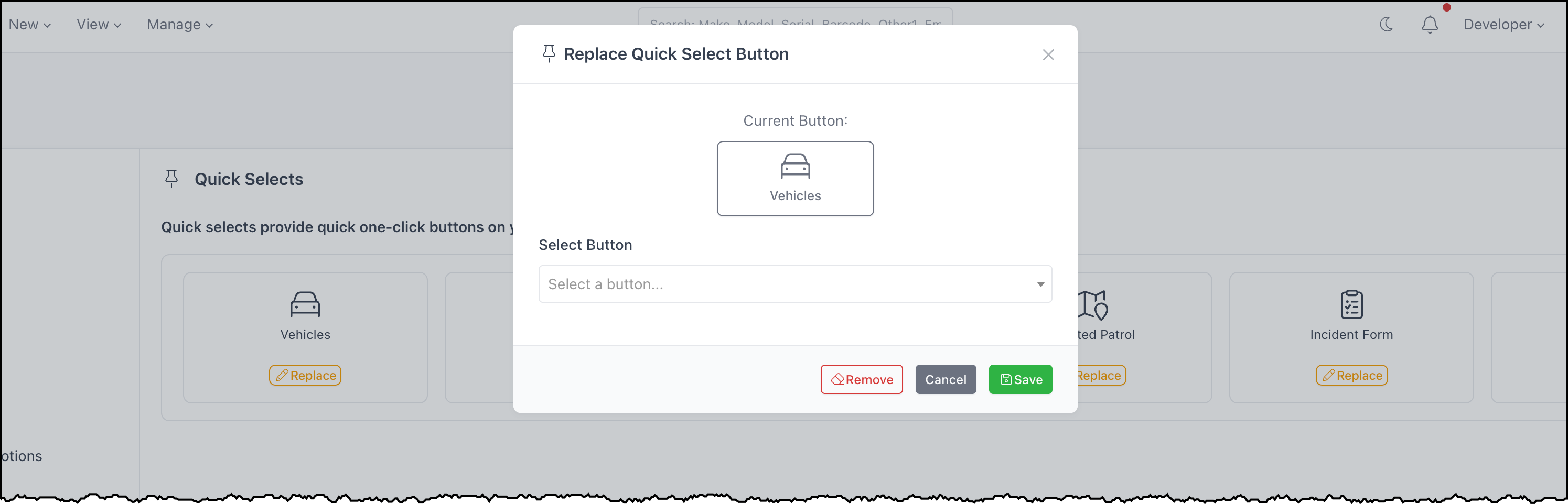 To modify a quick select buttons, simply click the replace link below the button you wish to replace.