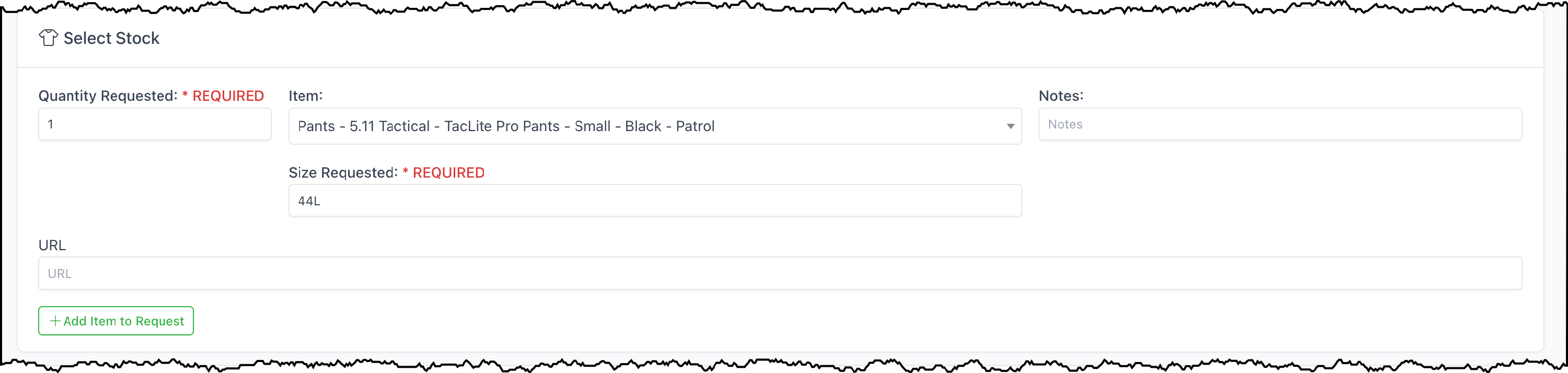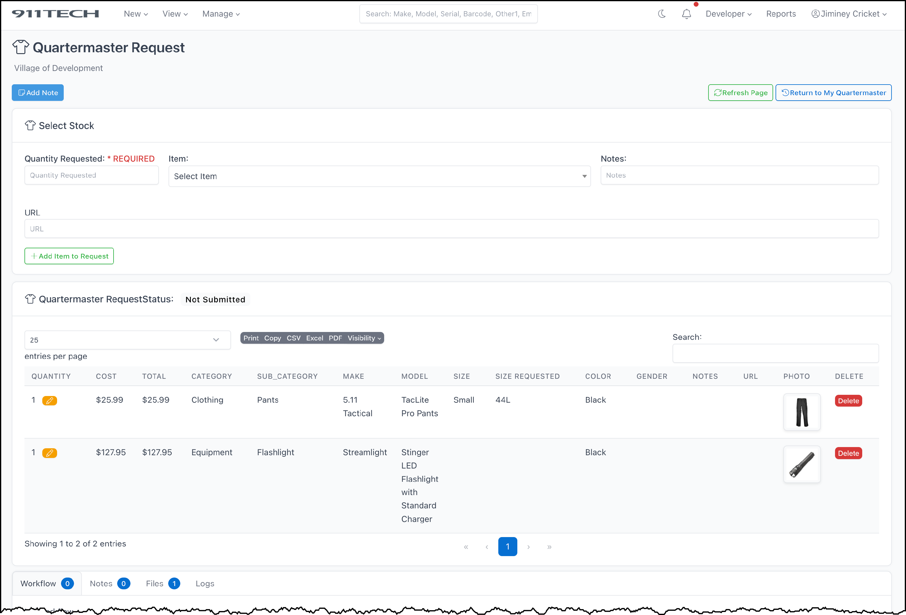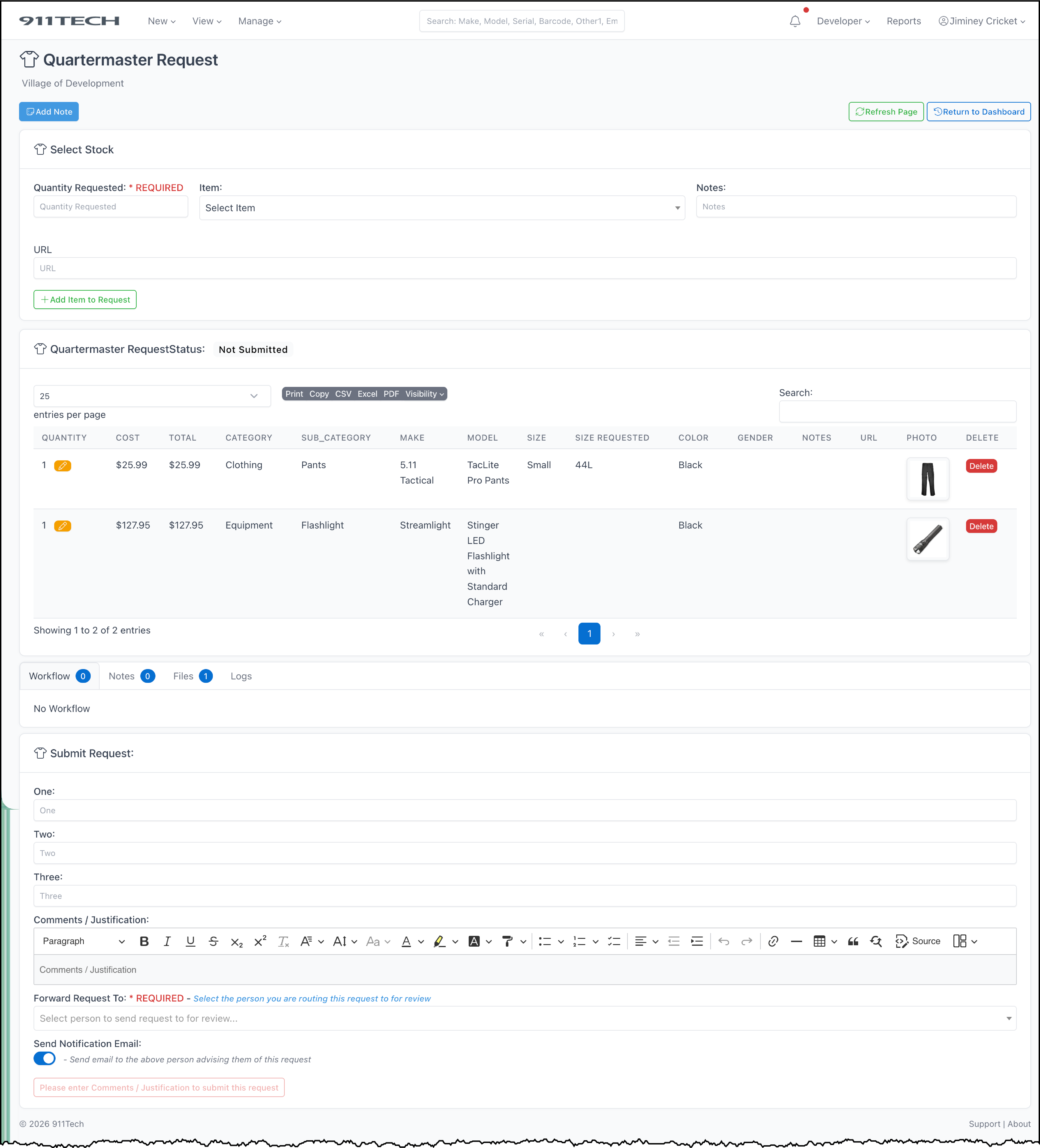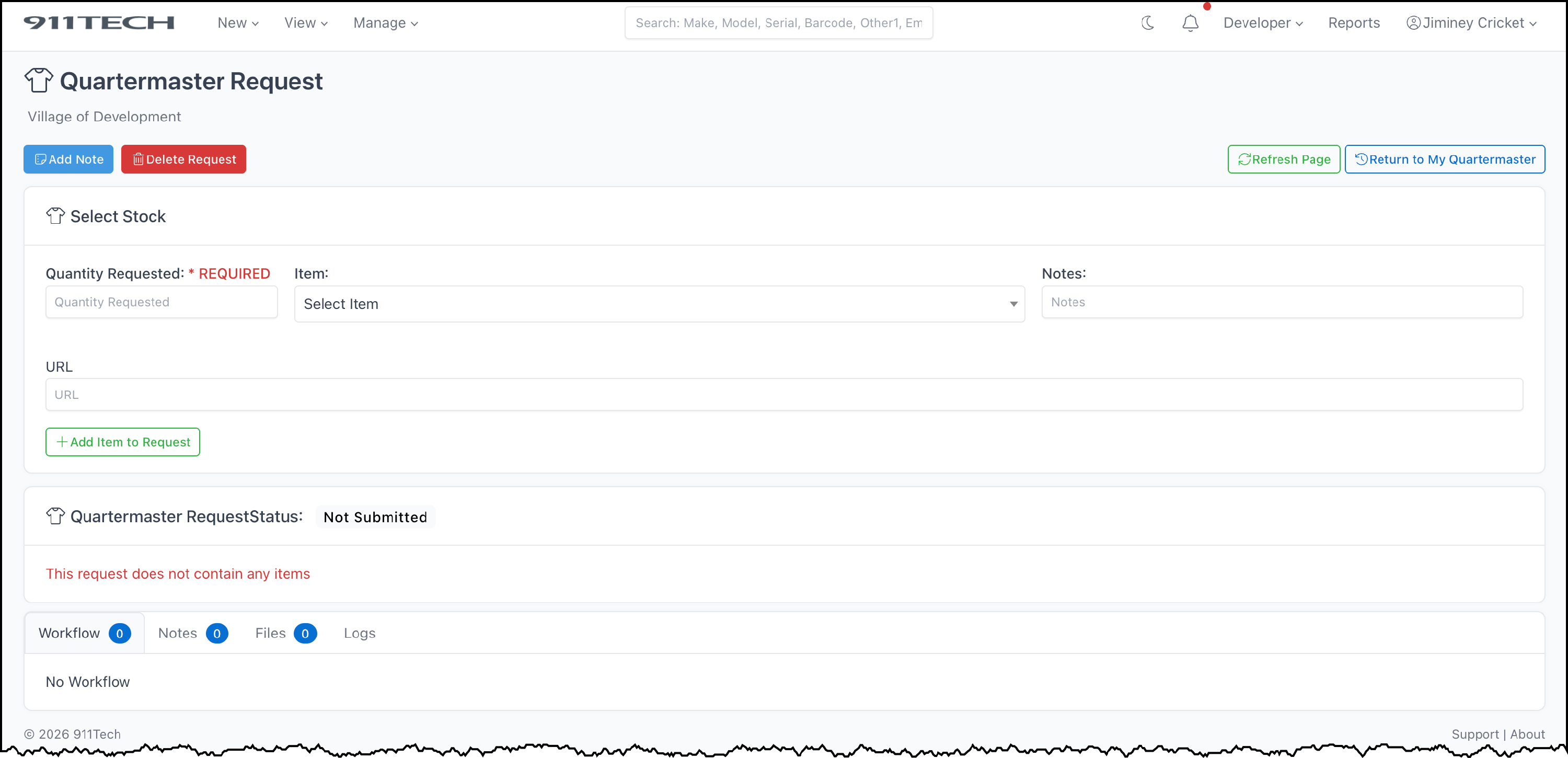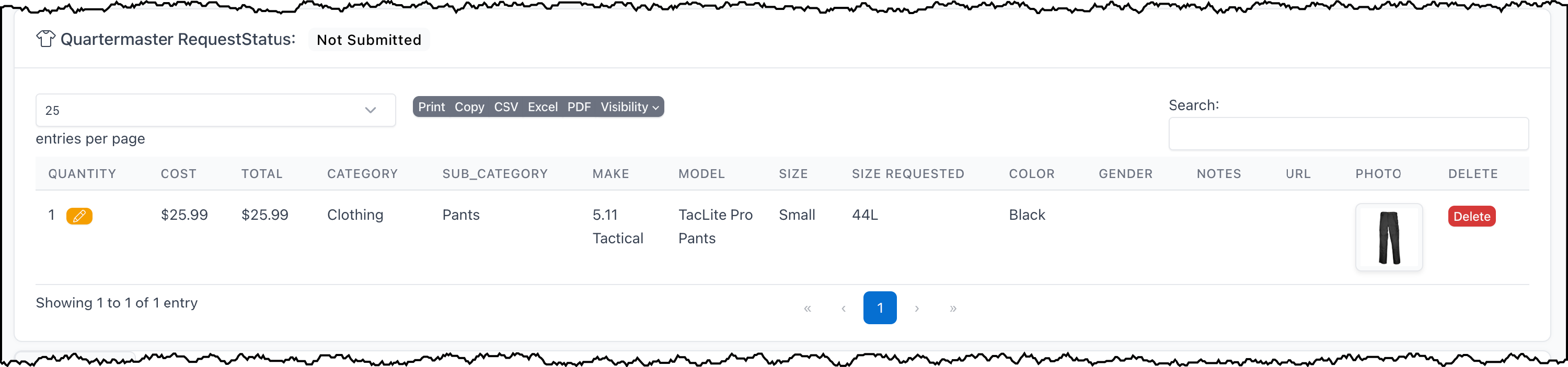 The screen will refresh and you will see the item has been added to the Quartermaster Request section