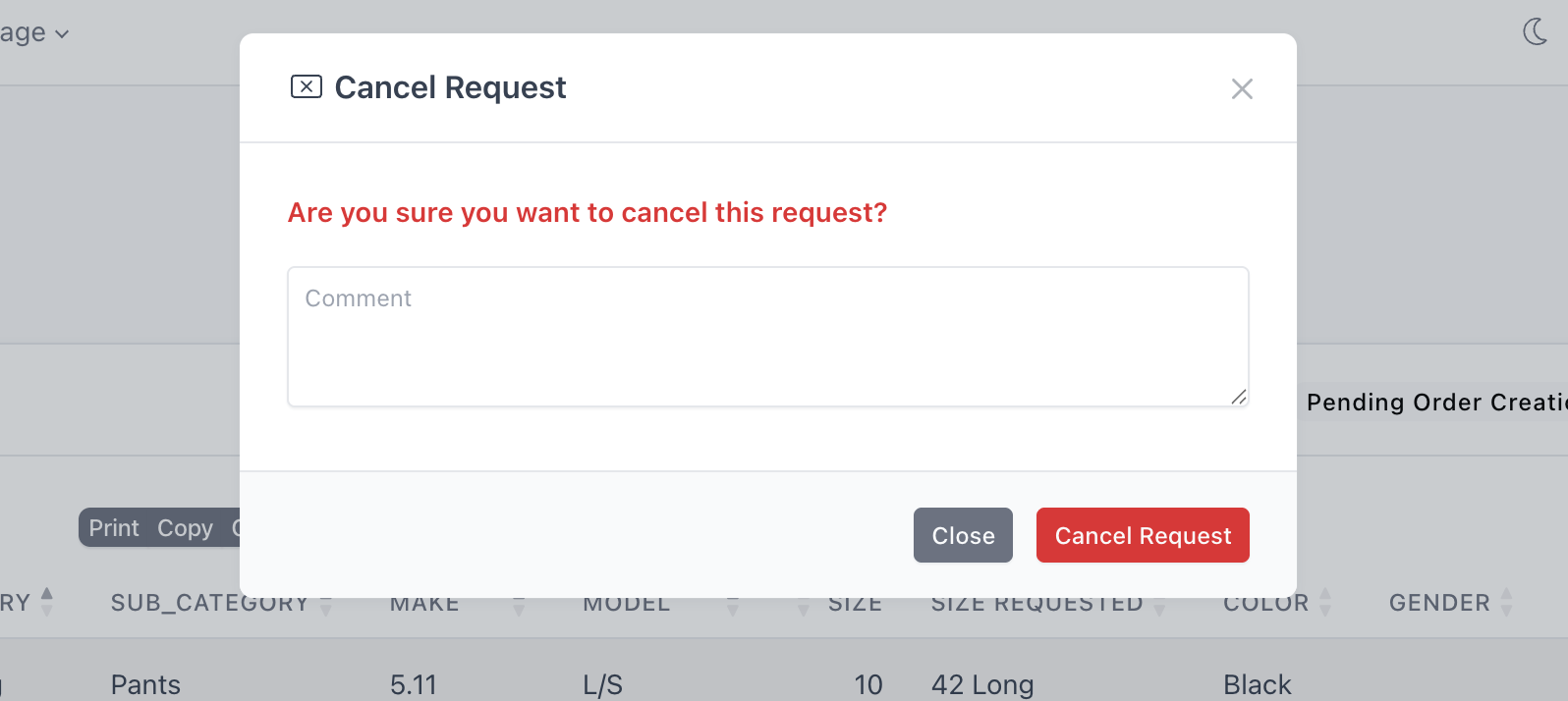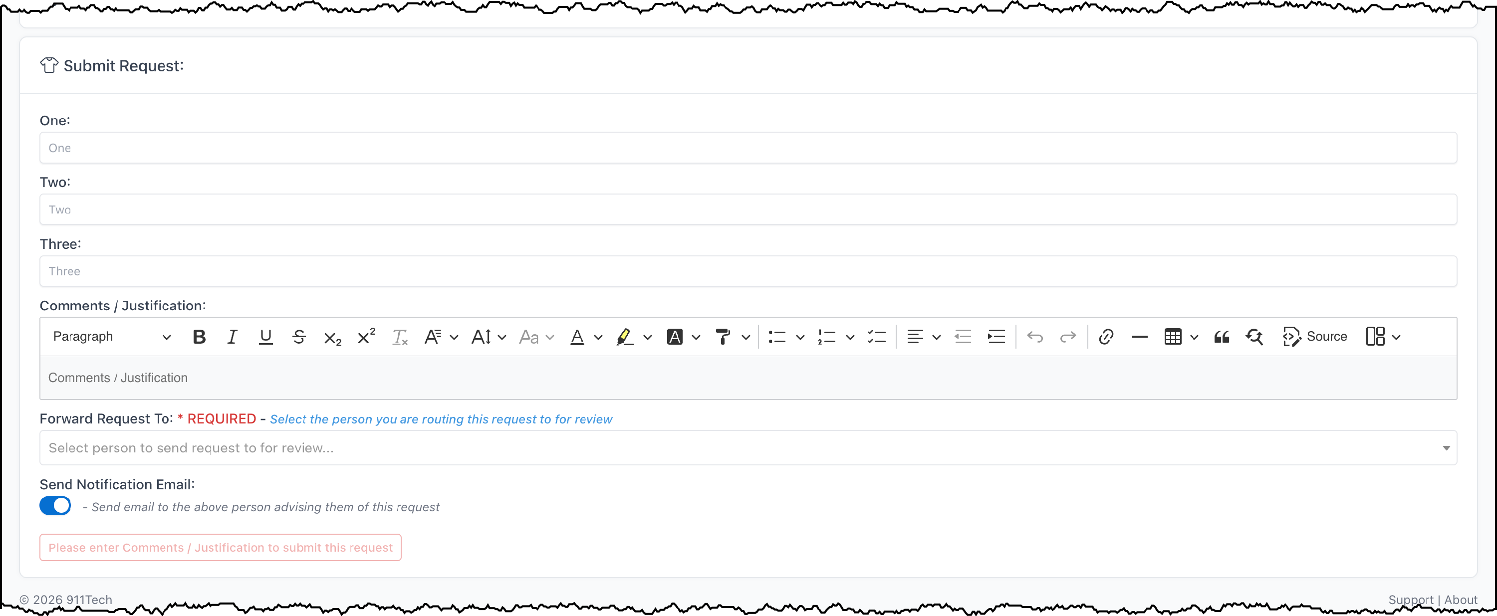 If your agency requires a Comment / Justification to submit the request, you submit button will be disabled until a Comment / Justification is entered into the text editor.