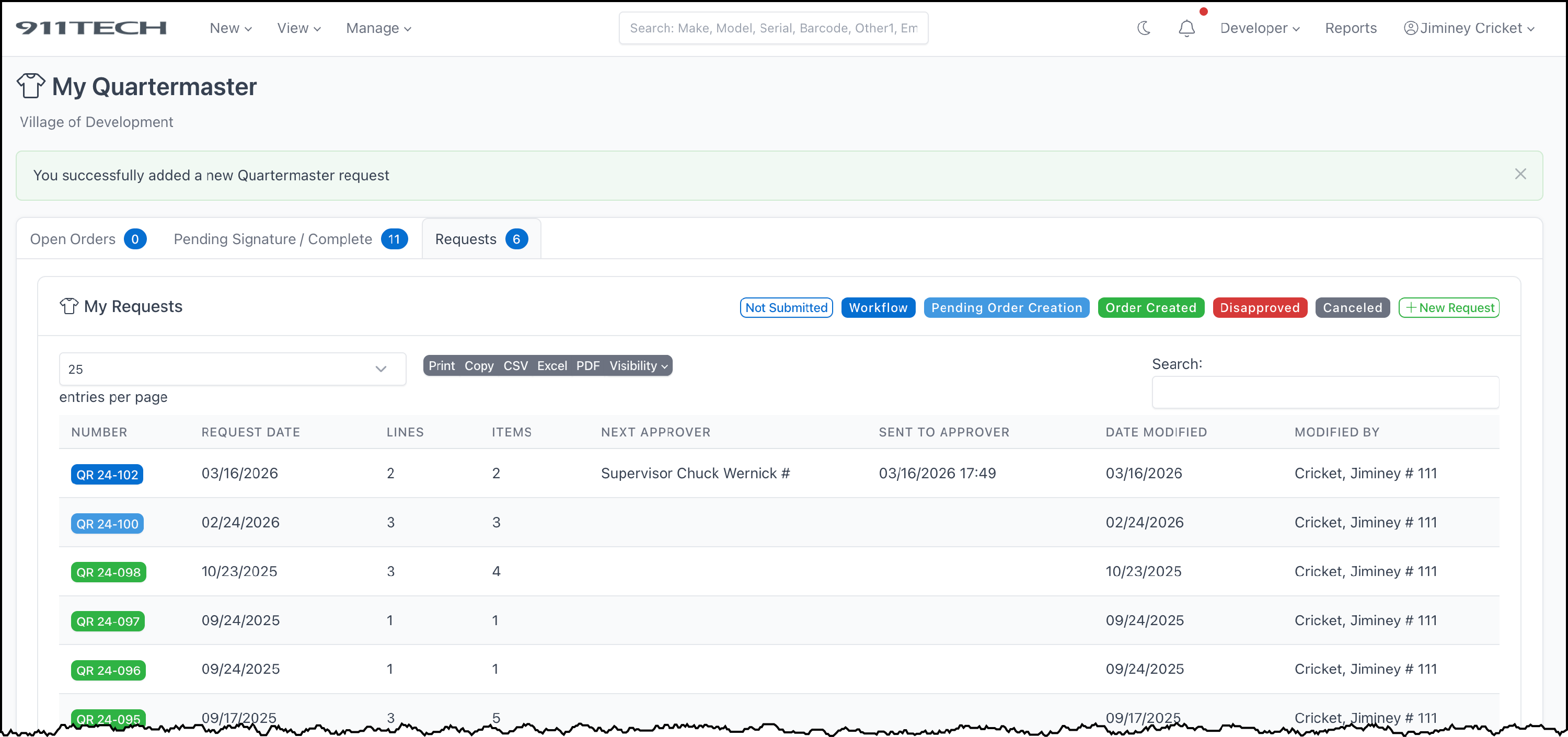 The screen will refresh and you will be on your My Quartermaster Dashboard. If you click the Request Tab, you will see your newly completed request in the list