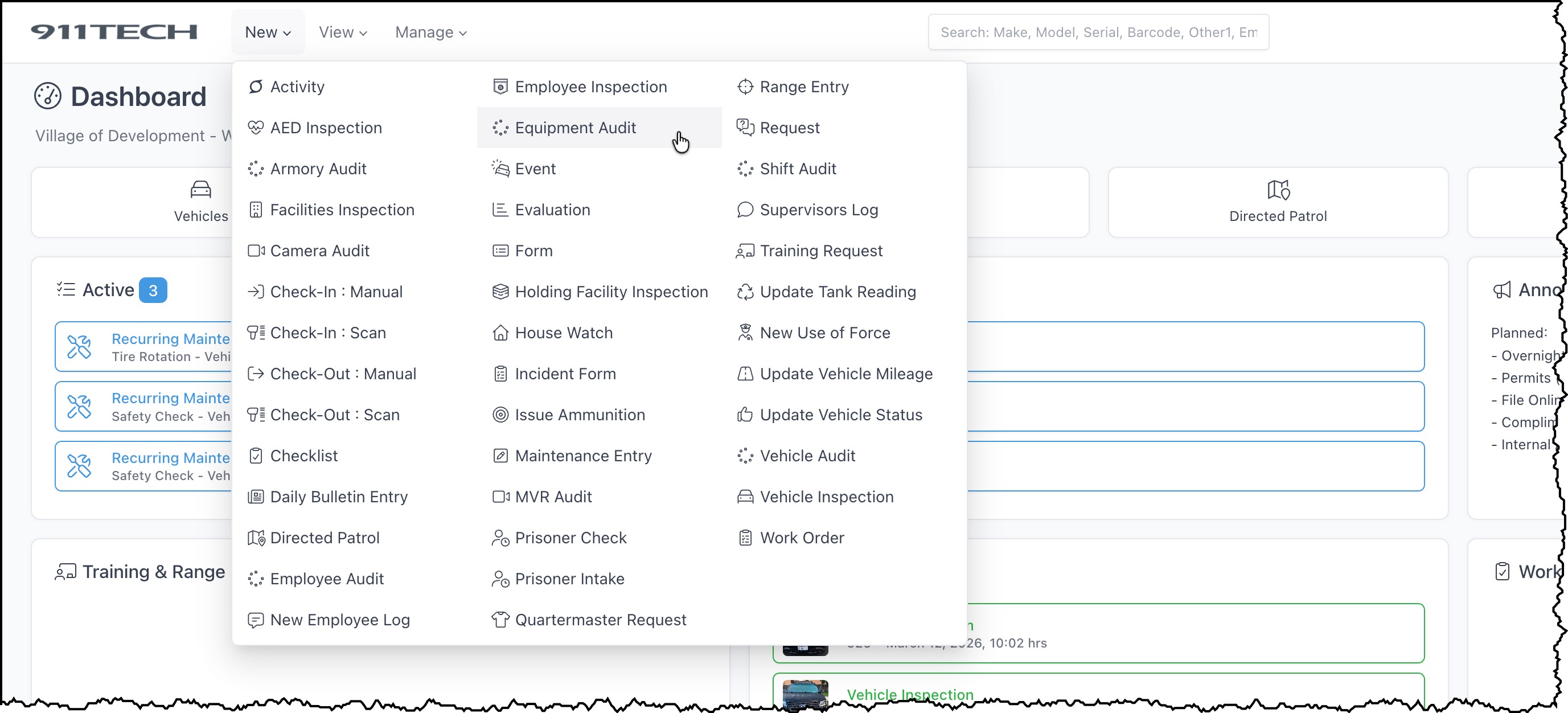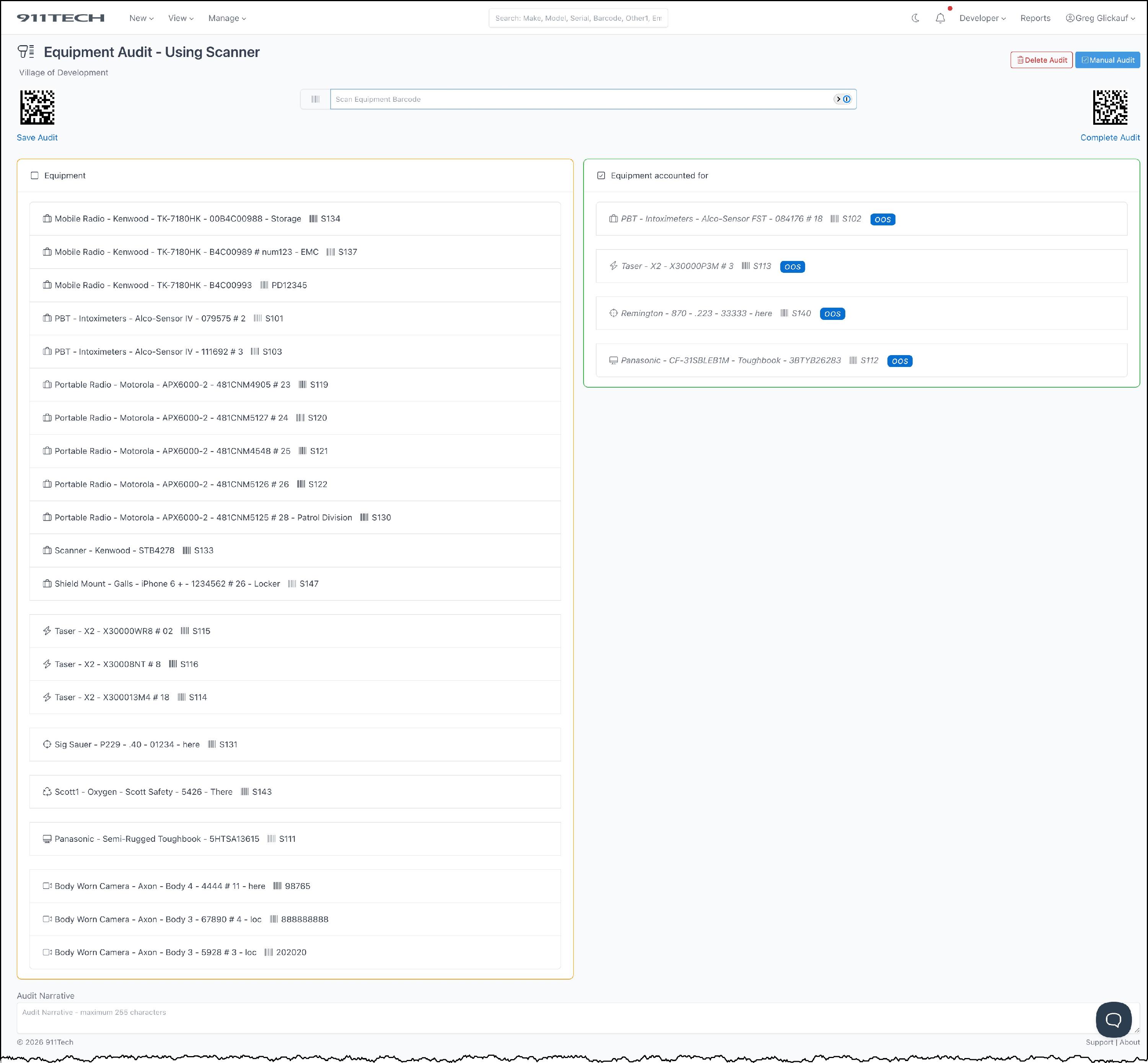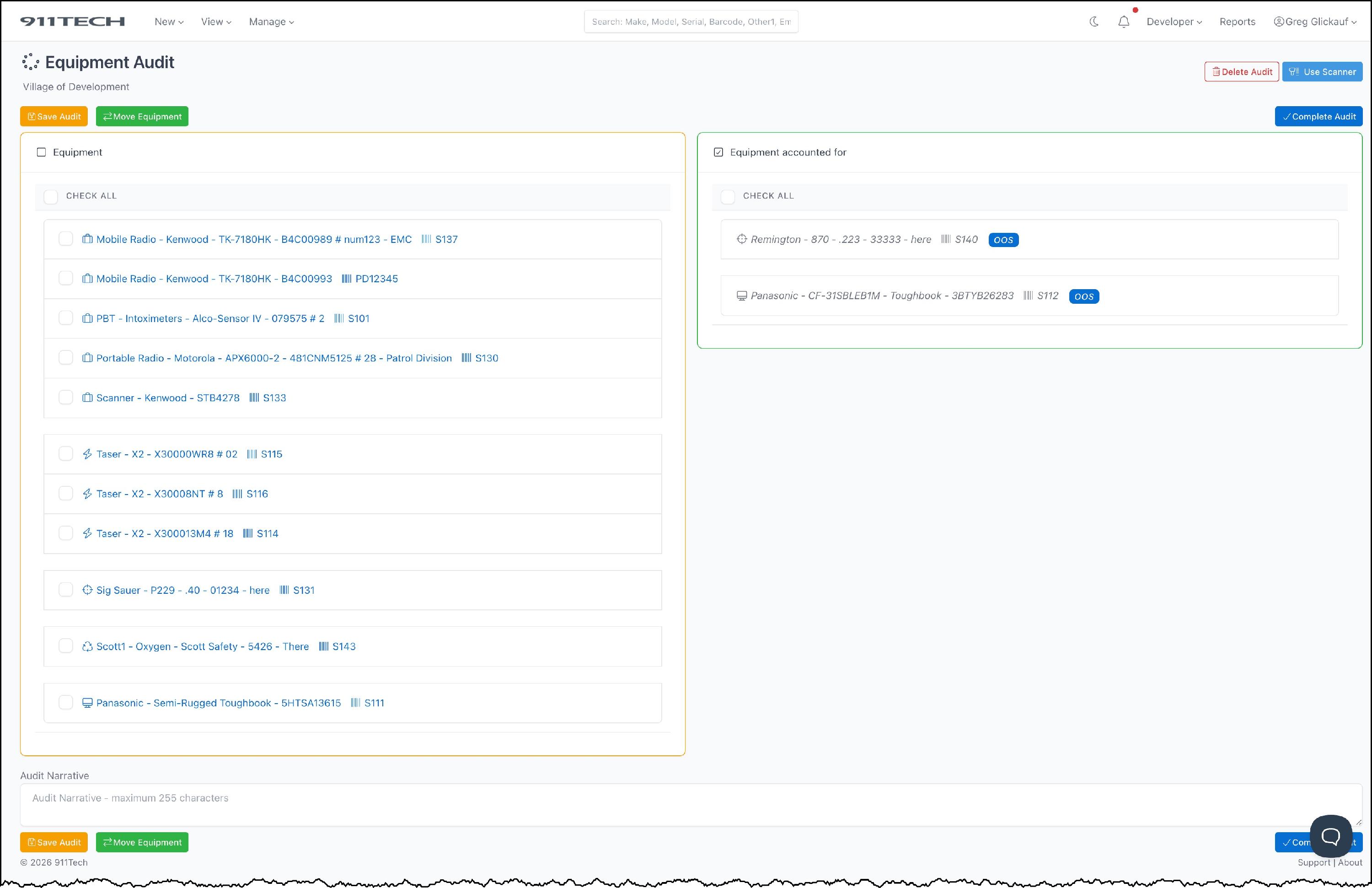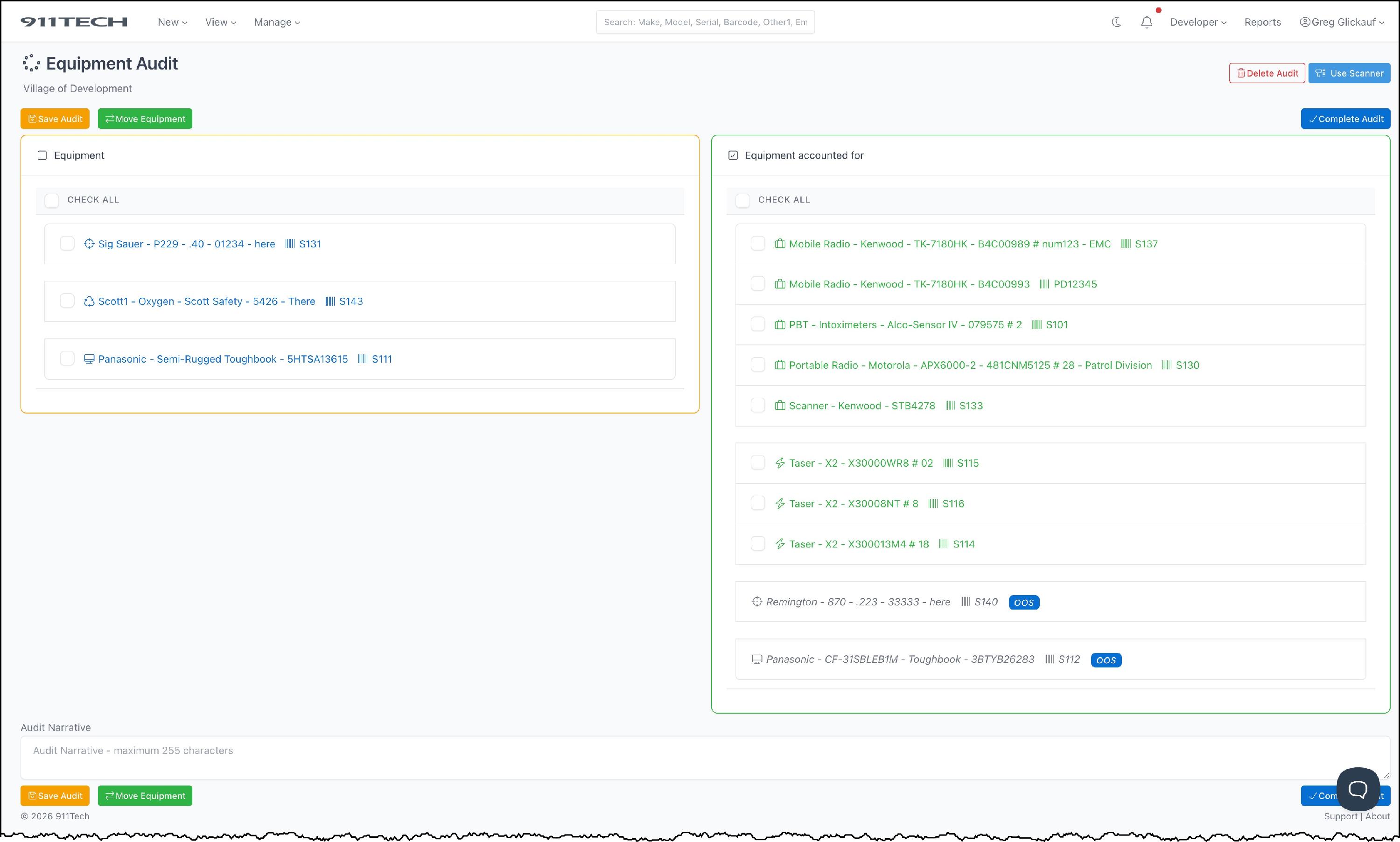 Equipment Audits allow agency's to quickly audit the agency's equipment and maintain a record of historical audits.