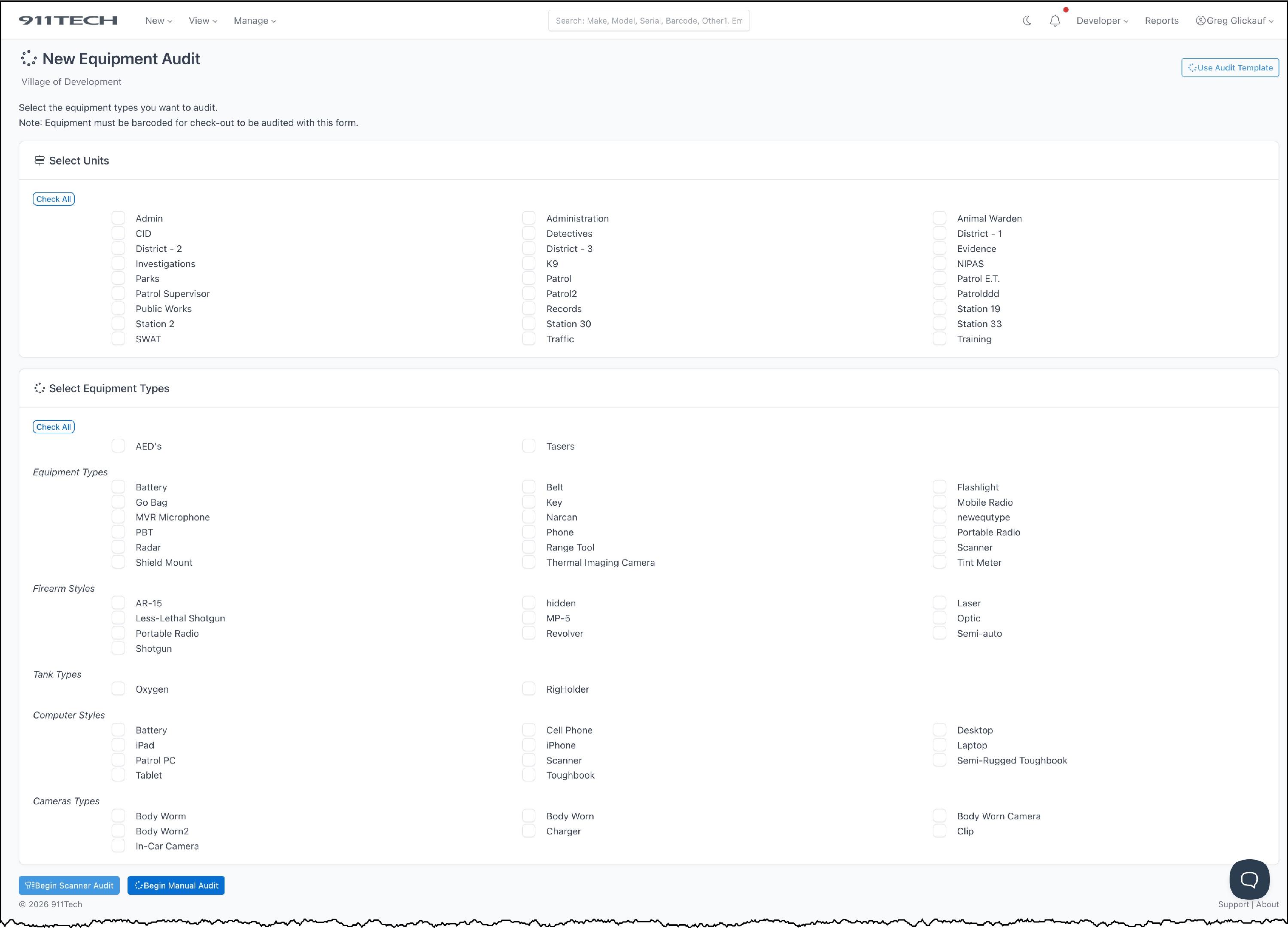 Select (check off) the Units (Optional) and Equipment Types and click Begin [Scanner /Manual] Audit.