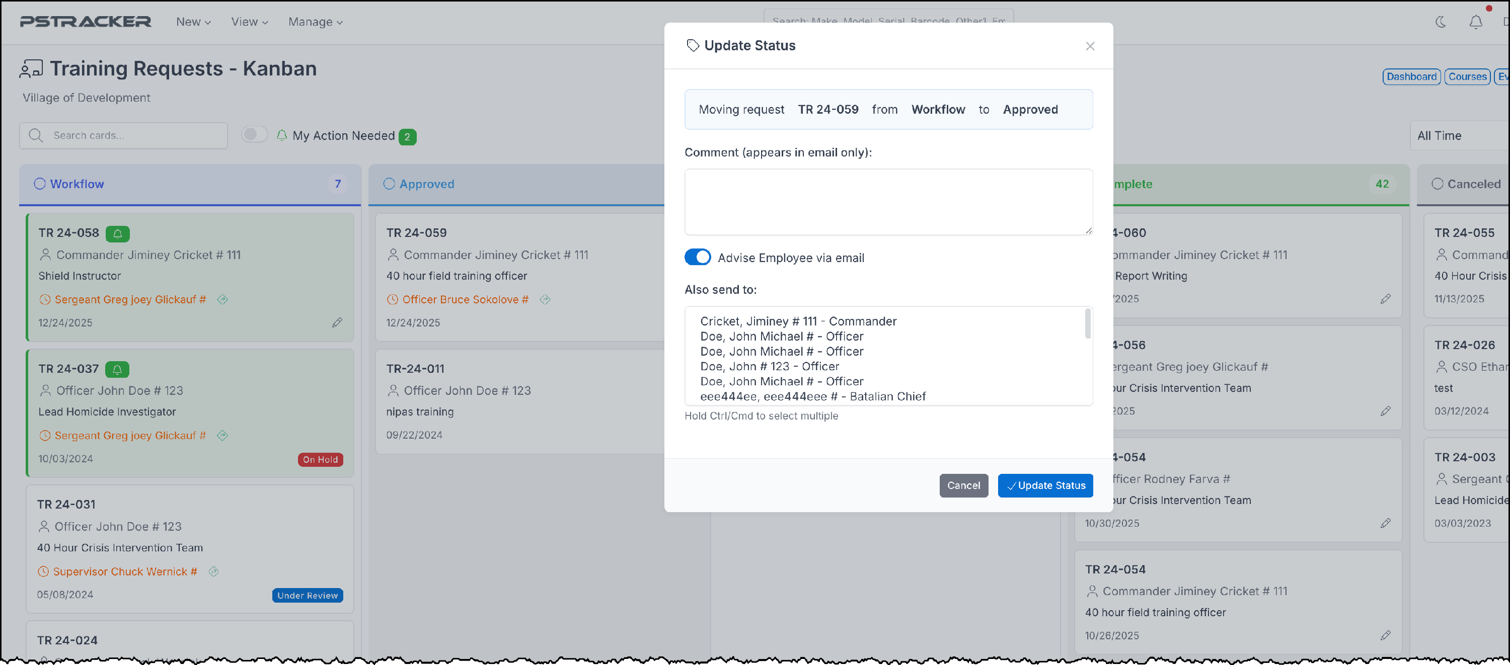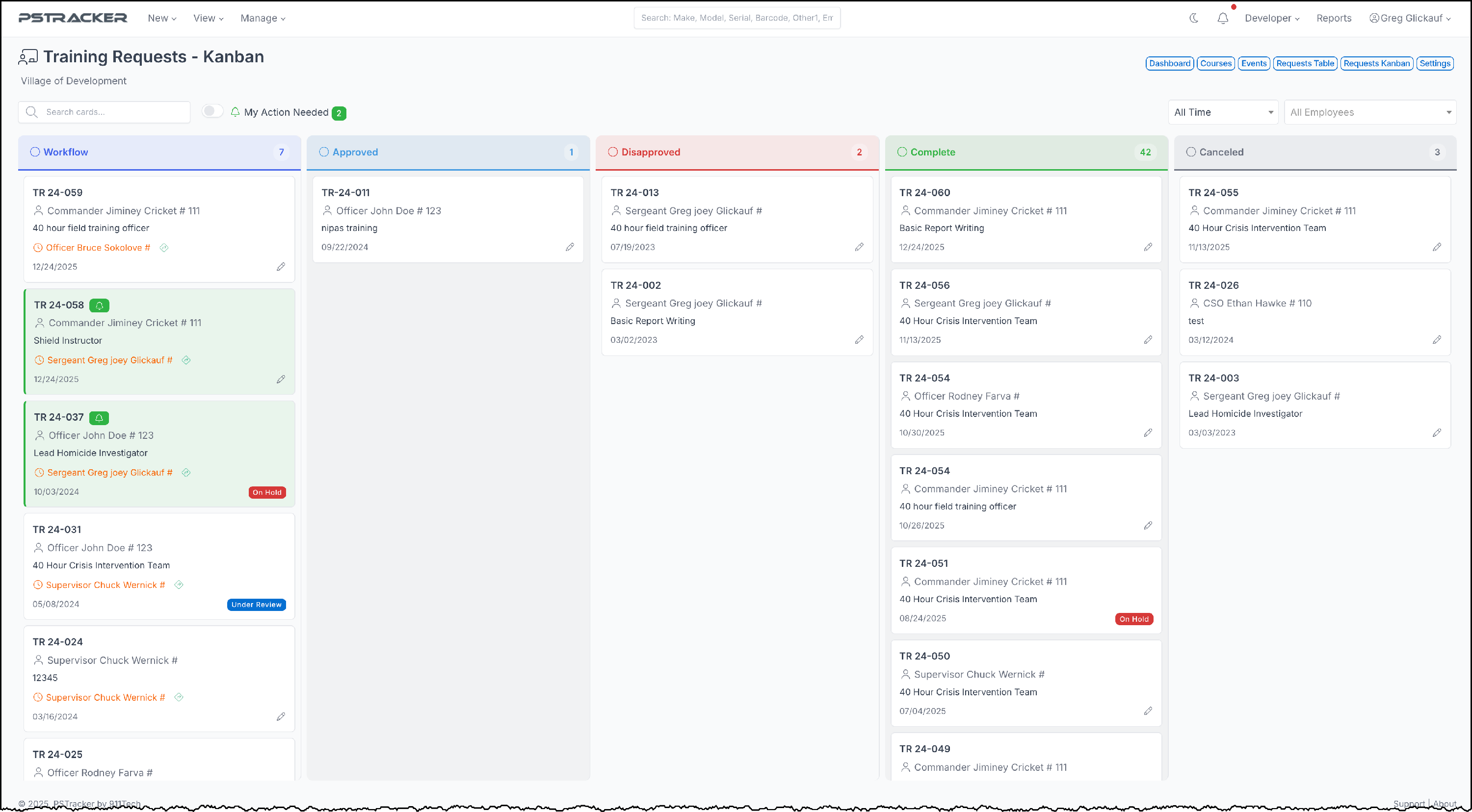The Training Requests Kanban Board provides a visual, drag-and-drop interface for managing training requests. Instead of a traditional table view, requests are displayed as cards organized into columns by status.