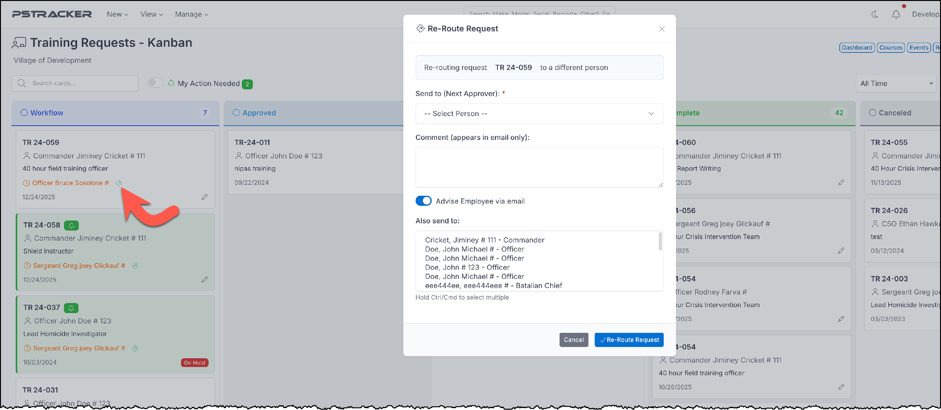 When dragging a card TO the Workflow column (from any other status), you'll see the Re-Route to Workflow modal instead. This requires you to select who should receive the request next.