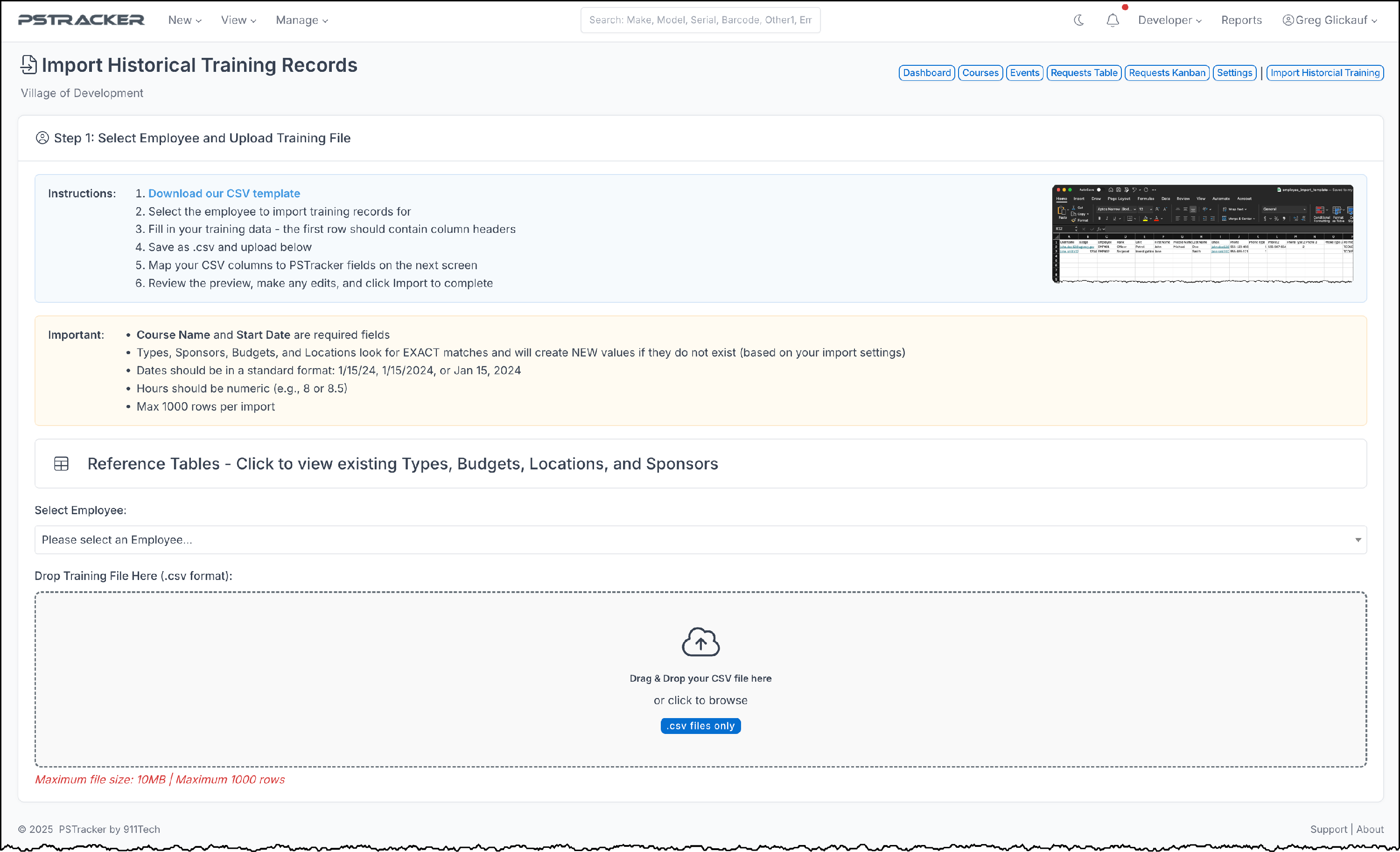 This guide explains how to import historical training records for employees using a CSV file. This feature is useful when migrating from another system or adding training history that wasn't previously tracked in the system.