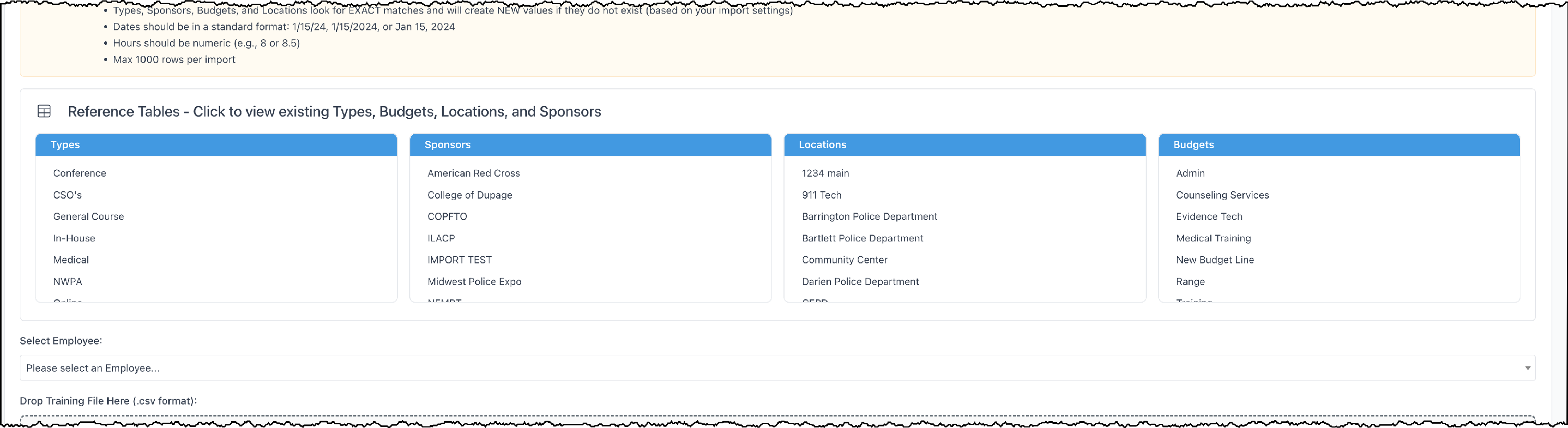 Review the Reference Tables (click to expand) to see existing Types, Budgets, Locations, and Sponsors. This helps ensure your CSV values match exactly.
