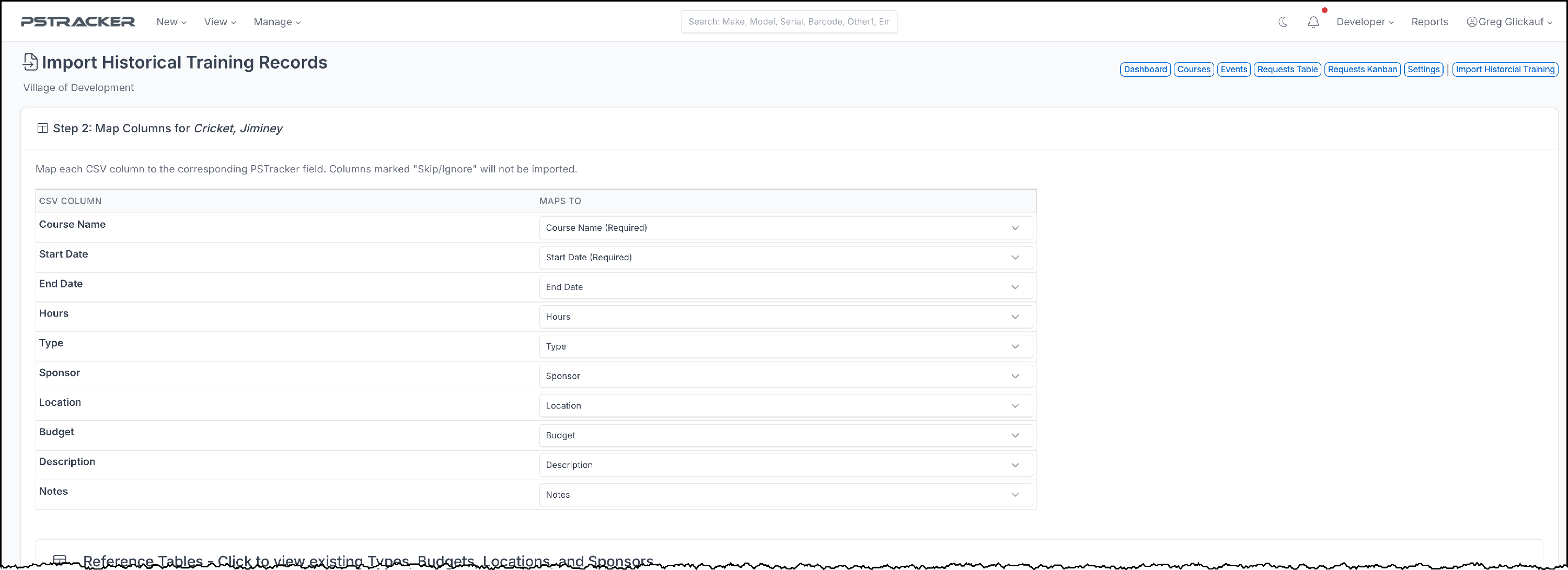 Click Reference Tables to expand and view existing values for Types, Budgets, Locations, and Sponsors. Values in your CSV that don't match exactly will be created as new entries (if the toggle is enabled).