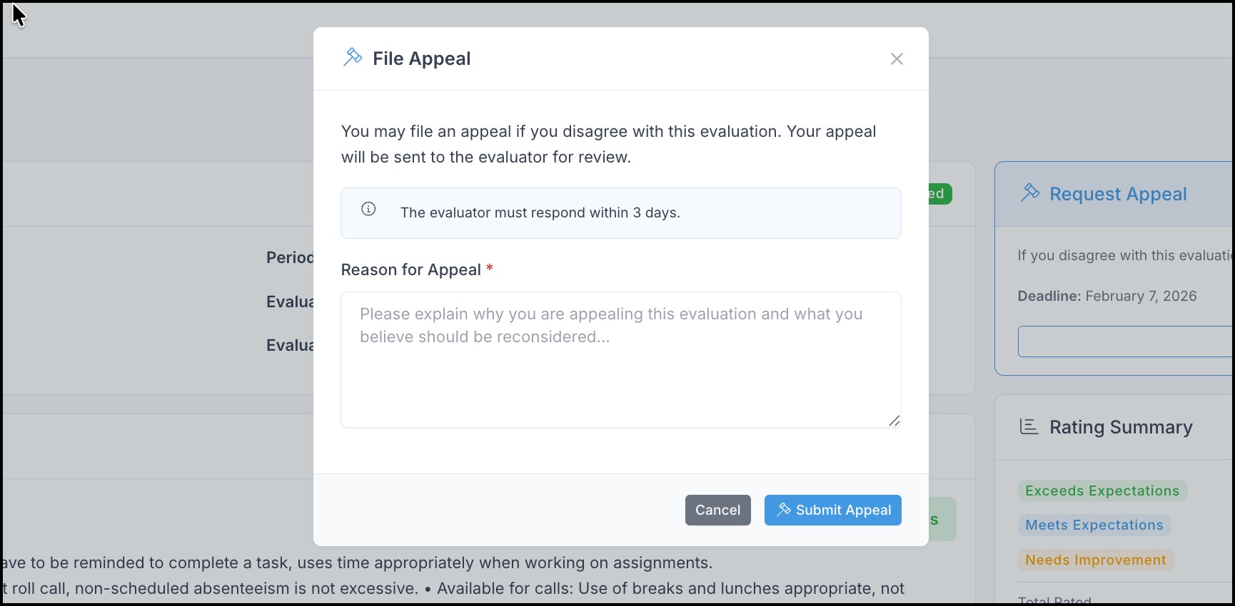 If you disagree with your evaluation, you may file an appeal within the allowed time window (typically 30 days after acknowledgment):