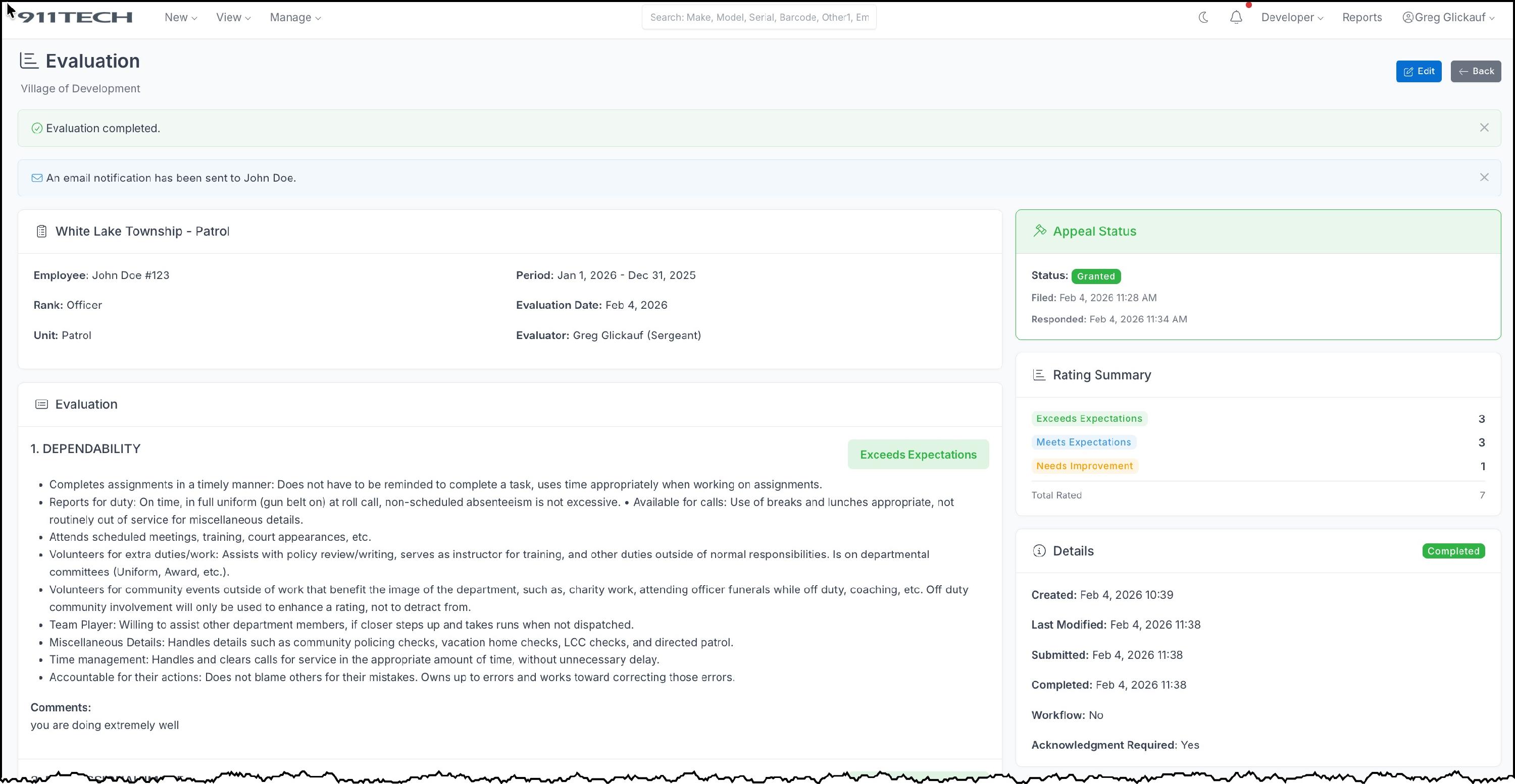 Your evaluator will be notified and must respond within the configured time period. You will receive an email when they respond.